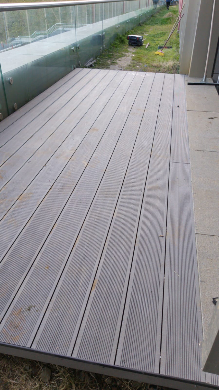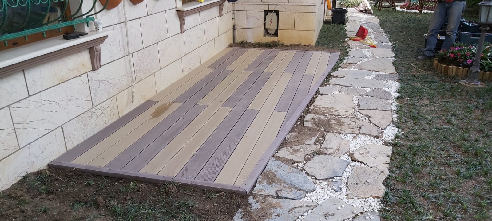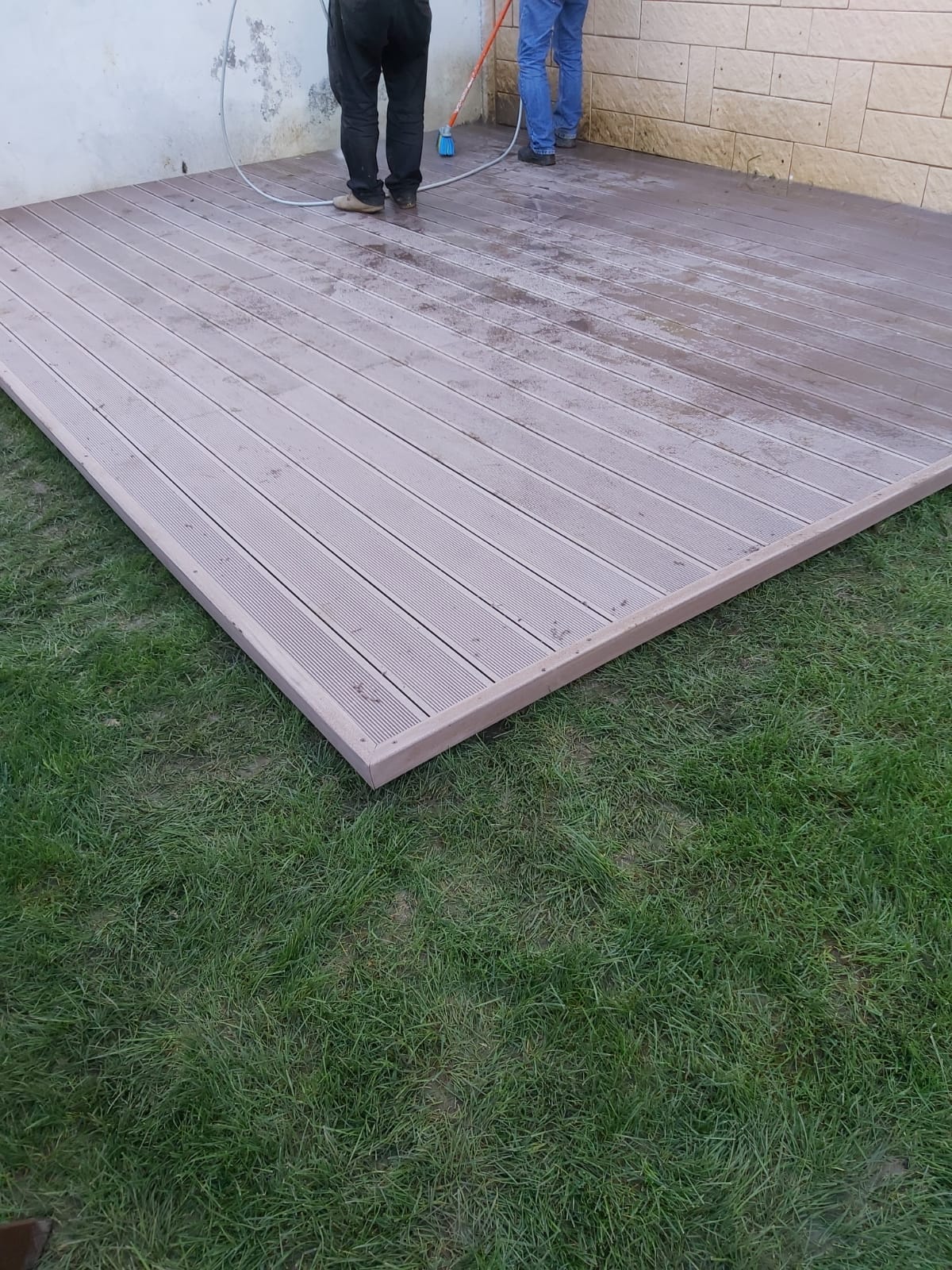 Azerbaycan'da WPC ahşap kompozit deck döşeme kurulumu yapılıyor. Uygulama başarılı oluyor.