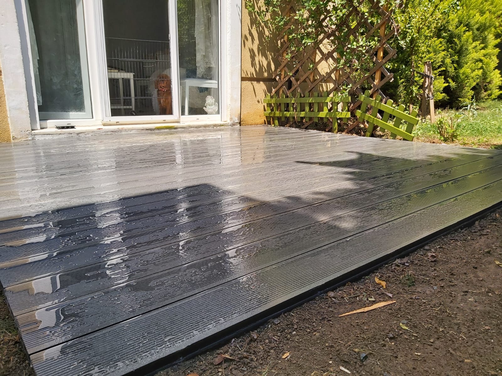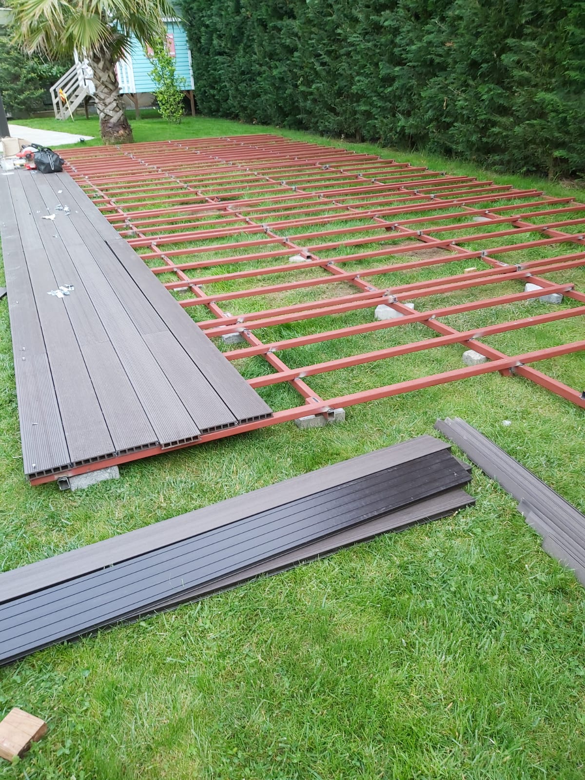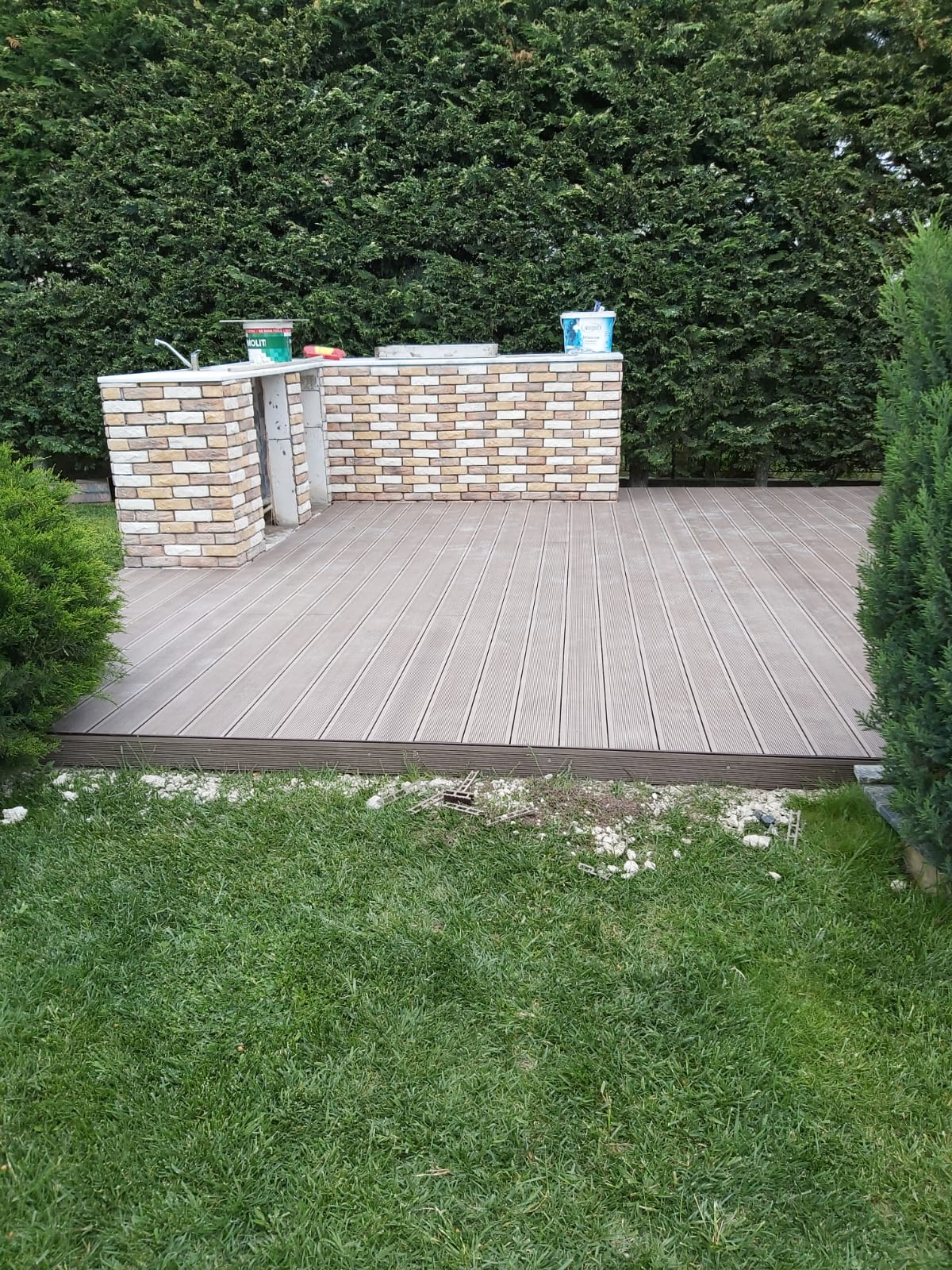 Azerbaycan'da WPC ahşap kompozit deck döşeme kurulumu yapılıyor. Uygulama başarılı oluyor.