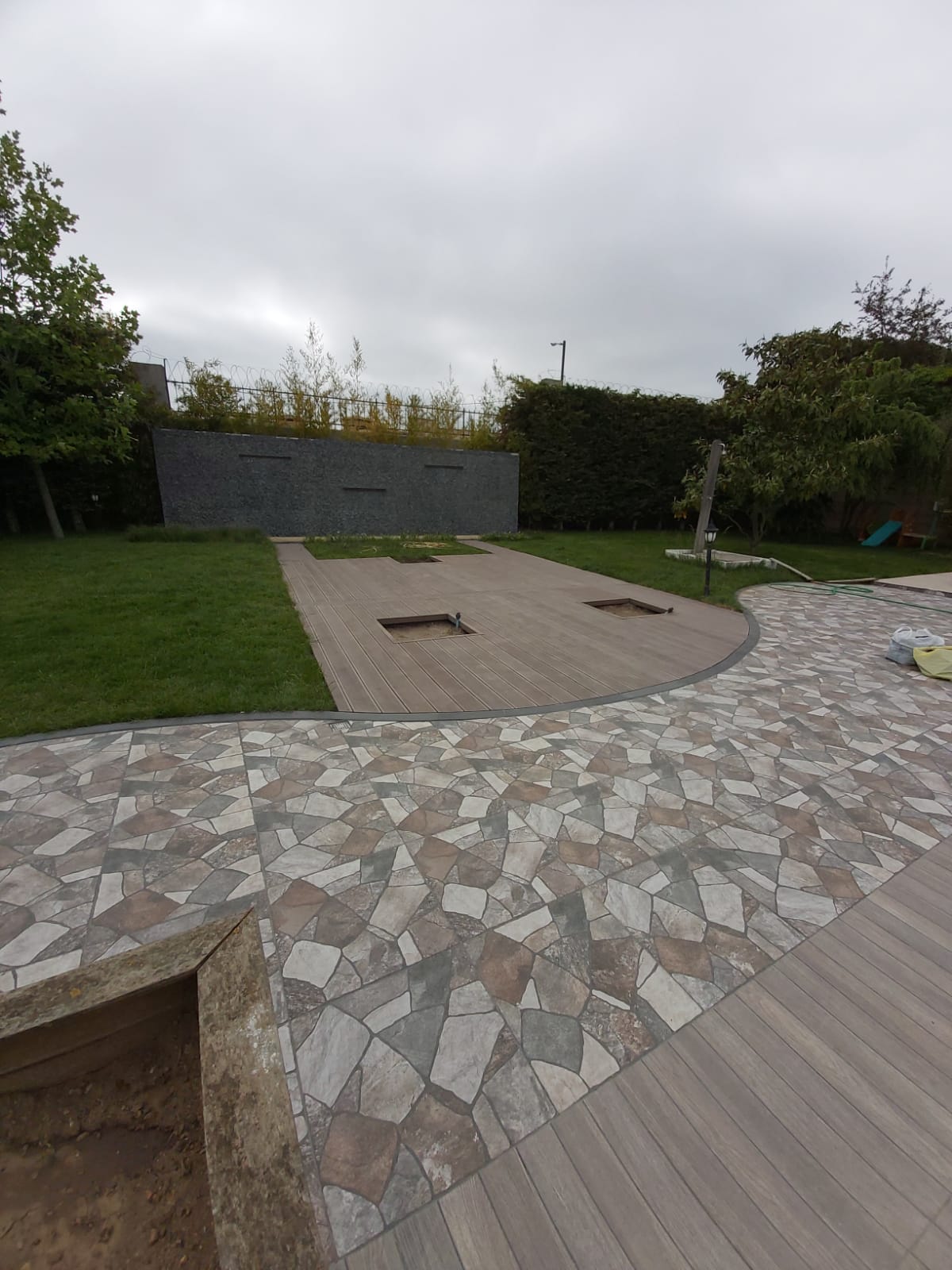 Azerbaycan'da WPC ahşap kompozit deck döşeme kurulumu yapılıyor. Uygulama başarılı oluyor.